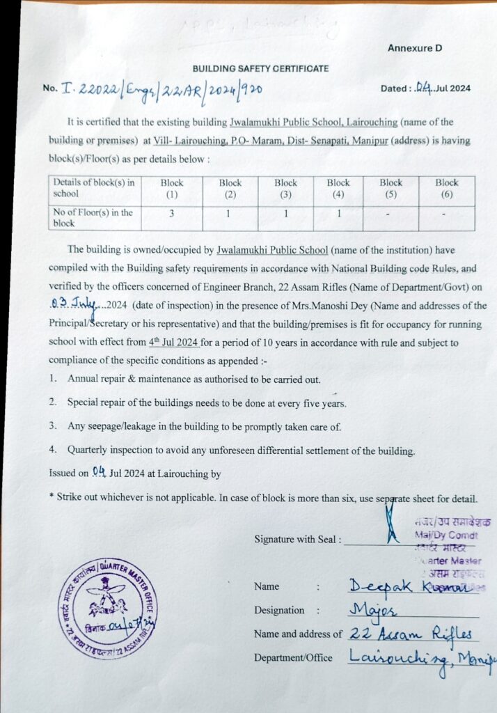 Assam Rifle JWALAMUKHI PUBLIC SCHOOL HQ SECT. 22 Assam Rifles C/O 99 APO, Lairouching SENAPATI, MANIPUR – 795107 PO – KARONG