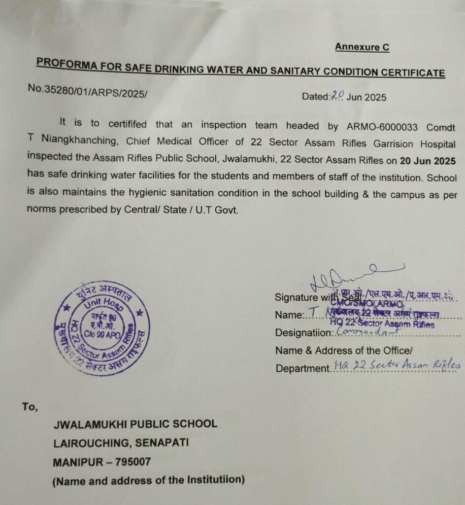 Issued after inspection by a medical team, this certificate ensures that the school provides clean drinking water and maintains proper sanitation, meeting the health standards prescribed by the Government. It is crucial for student hygiene, health, and well-being.
